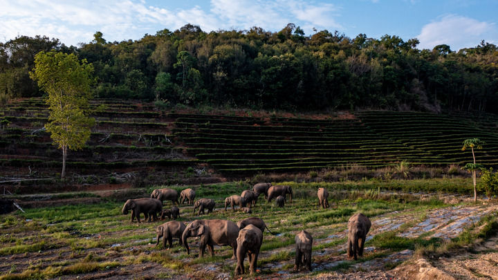 “短鼻家族”和“然然家族”的野象在云南省西雙版納州景洪市大渡崗鄉大荒壩村覓食(2023年5月9日攝,無(wú)人機照片)。新華社記者 胡超 攝