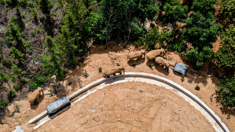 在云南省玉溪市峨山縣境內拍攝的北遷象群(2021年5月28日攝,無(wú)人機照片)。新華社記者 胡超 攝