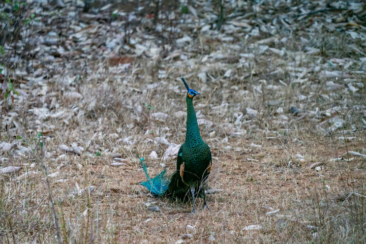 在云南楚雄雙柏縣恐龍河自然保護區拍攝的綠孔雀(2023年4月20日攝)。新華社記者 胡超 攝
