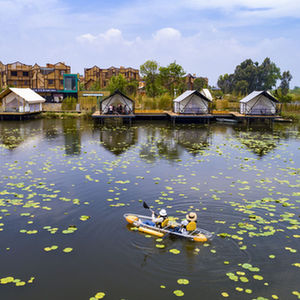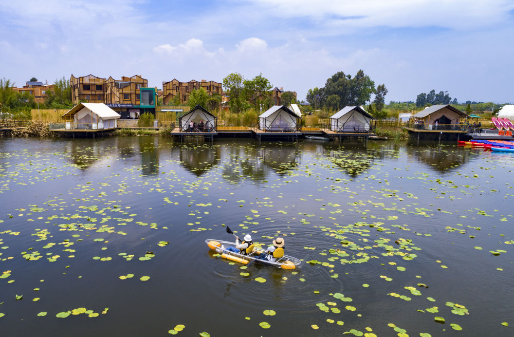 游人在滇池南岸晉寧區上蒜鎮小漁村劃船休閑(2023年4月30日攝,無(wú)人機照片)。新華社記者 陳欣波 攝