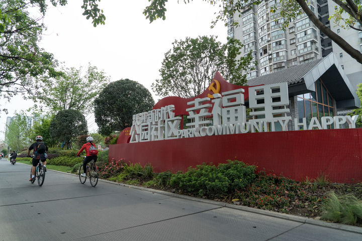 在成都市金牛區,居民在躍進(jìn)社區黨群服務(wù)中心外的綠道上騎行(4月26日攝)。新華社記者 唐文豪 攝