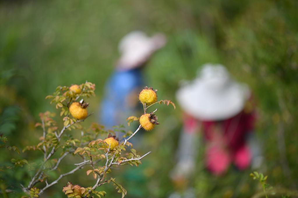 農戶(hù)在貴州省龍里縣茶香村采摘刺梨。
