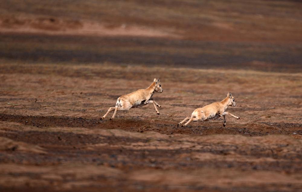 兩只藏羚羊在可可西里卓乃湖區域活動(dòng)(6月17日攝)。 新華社記者 張宏祥 攝