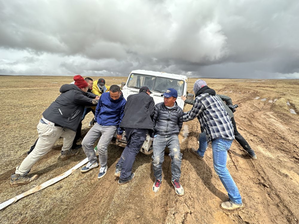 兩次前往卓乃湖都是夏天,原本的凍土和沼澤融化成一個(gè)個(gè)爛泥灘,車(chē)輛陷在泥里,動(dòng)彈不得。望著(zhù)眼前的車(chē)轍,工作多年的巡山隊員才索加想起了距離死亡最近的一次巡山。