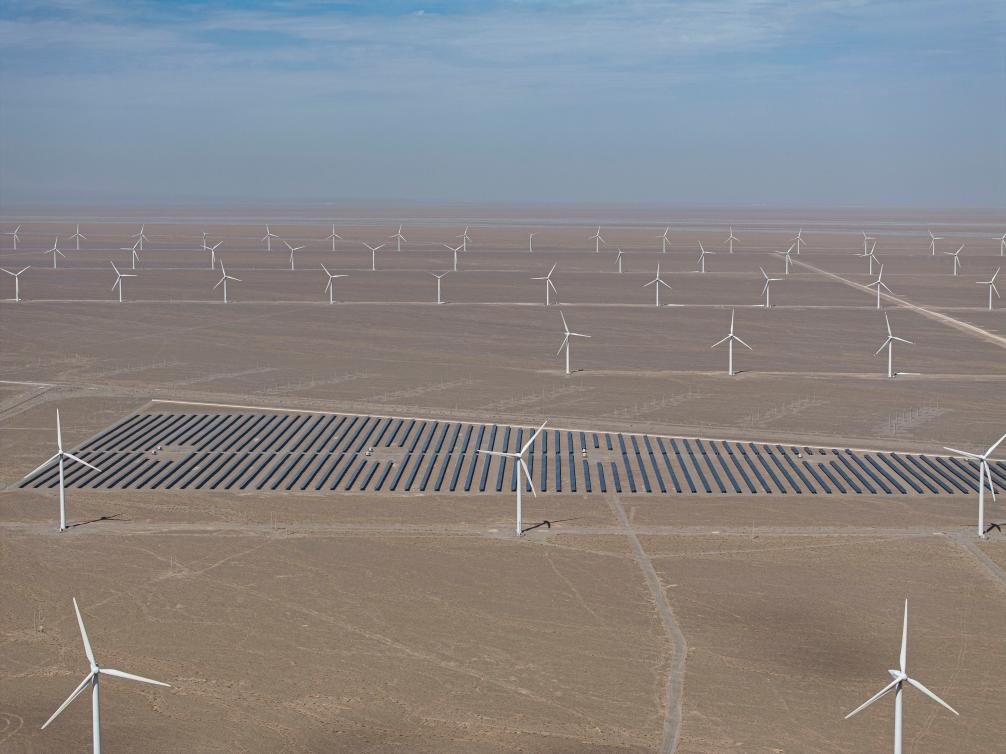 這是8月8日拍攝的甘肅省玉門(mén)市一處風(fēng)電場(chǎng)(無(wú)人機照片)。新華社記者 張可任 攝`