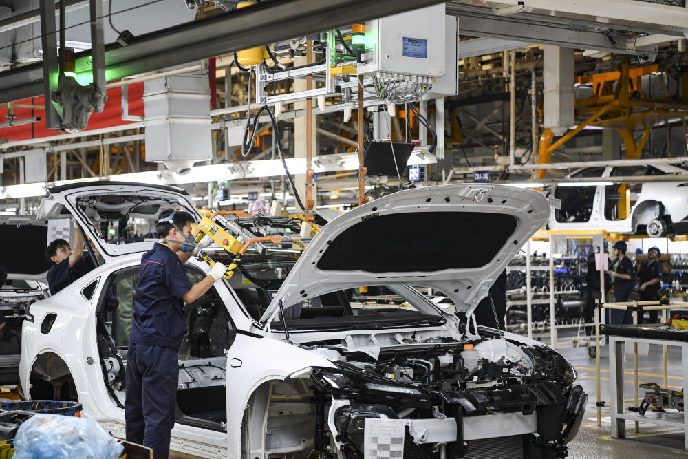 長(cháng)安汽車(chē)重慶兩江智能工廠(chǎng)工人在作業(yè)(2022年6月16日攝)。新華社記者 王全超 攝
