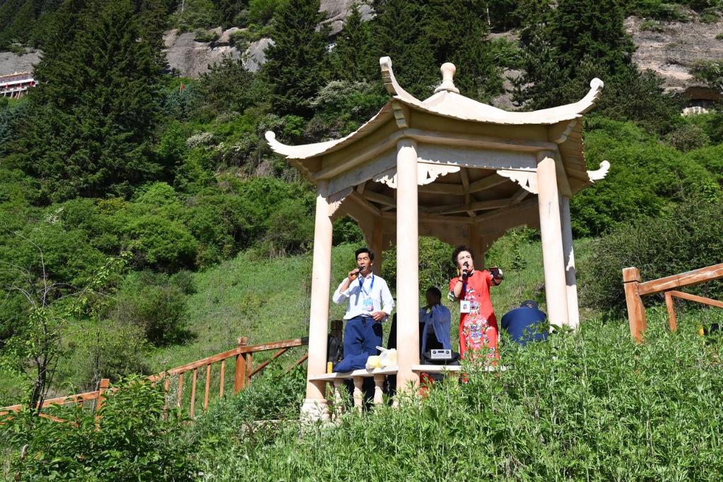 6月13日,在甘肅省臨夏回族自治州和政縣松鳴巖景區,花兒愛(ài)好者表演花兒。新華社記者 范培珅 攝