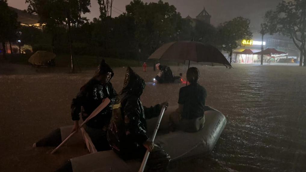5日晚,躍進(jìn)村水位不斷上漲,村干部用皮劃艇轉移村民。(受訪(fǎng)者供圖)