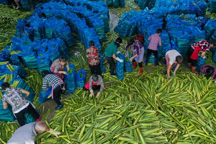 在浙江省麗水市景寧畬族自治縣大漈鄉大漈村茭白交易市場(chǎng),村民將新收割的茭白打包冷藏(2021年8月25日攝,無(wú)人機照片)。
