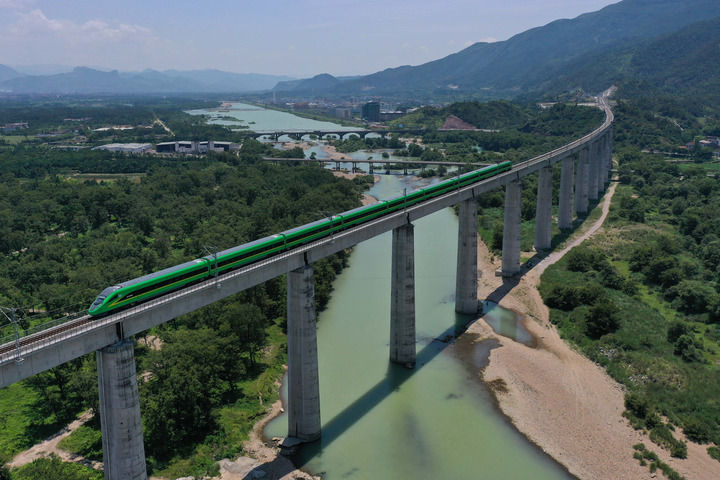列車(chē)行駛在金臺鐵路仙居縣境內的永安溪特大橋上(2021年6月25日攝,無(wú)人機照片)。新華社記者 黃宗治 攝