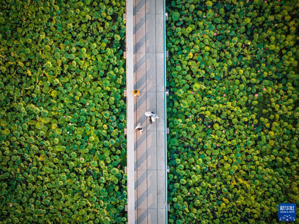 8月12日,市民在杭州市上城區丁蘭街道桃花湖公園內游玩(無(wú)人機照片)。新華社記者 江漢 攝