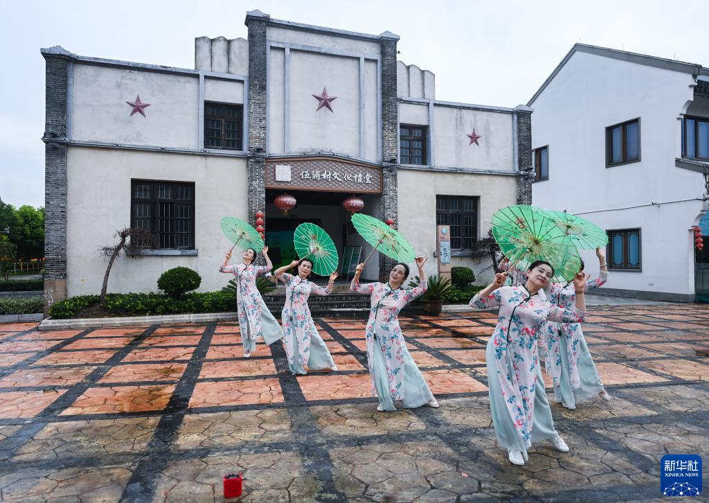 7月5日,老年舞蹈隊在湖州市織里鎮伍浦村文化禮堂前排練。新華社記者 徐昱 攝