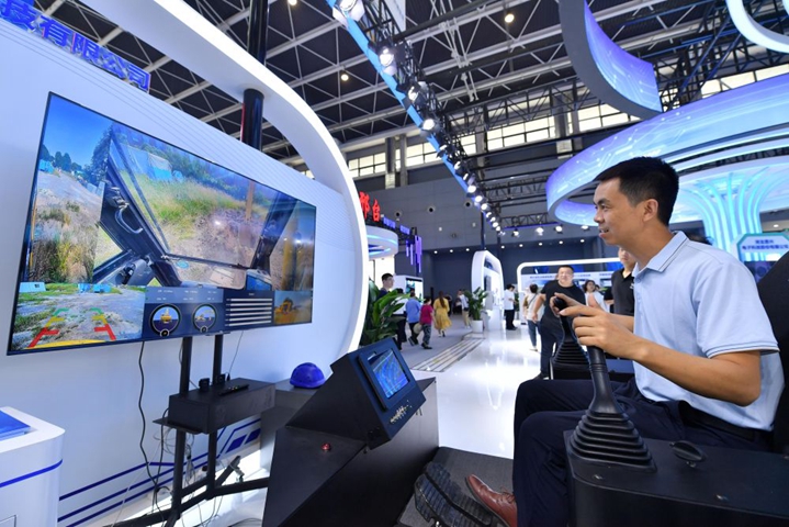 9月7日,參觀(guān)者在河北省石家莊舉行的2023中國國際數字經(jīng)濟博覽會(huì )上體驗挖掘機5G遠程駕駛系統。新華社記者 駱學(xué)峰 攝