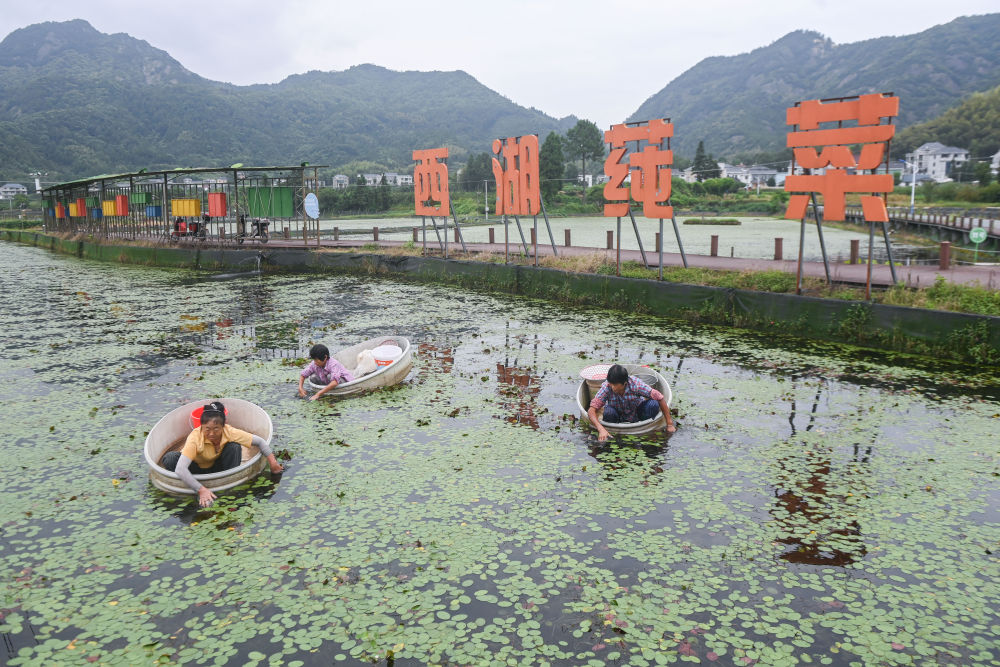 9月5日,在浙江省建德市航頭鎮烏龍村莼菜基地,村民劃著(zhù)“盆船”在西湖莼菜產(chǎn)業(yè)園種植基地的水面上采摘西湖莼菜。近年來(lái),浙江建德市航頭鎮以黨建聯(lián)建為紐帶,圍繞轄區特色農業(yè)產(chǎn)業(yè)園建設,發(fā)揮新鄉賢、鄉土人才、農創(chuàng )客作用,在烏龍村投資600余萬(wàn)元新建了占地1900平方米的西湖莼菜產(chǎn)業(yè)園,引導新鄉賢爭當農業(yè)致富帶頭人,打造西湖莼菜共富工坊。新華社記者 徐昱 攝