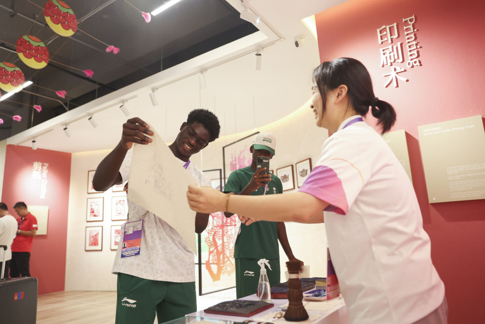 9月29日,沙特阿拉伯運動(dòng)員穆罕默德·杜海姆·穆阿維(左)在亞運村體驗雕版印刷。新華社記者 胡星宇 攝