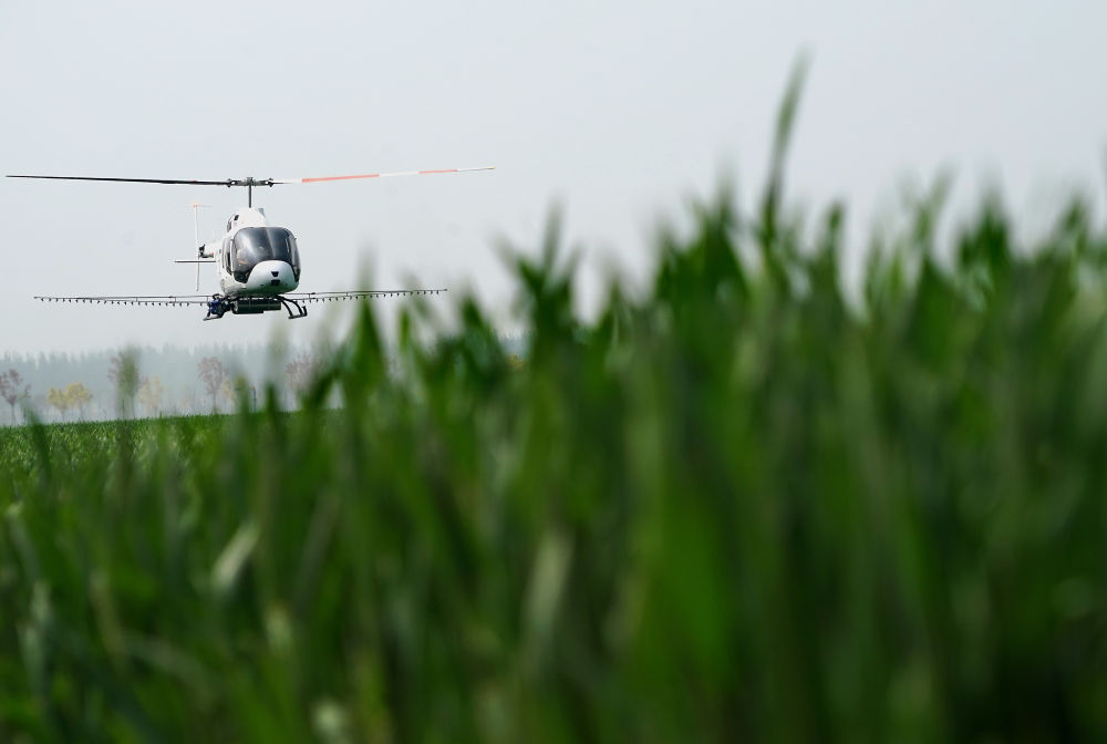 在河南省商水縣南陵村一處高標準農田里,直升機在進(jìn)行植保作業(yè)(2021年4月15日攝)。新華社記者 李安 攝