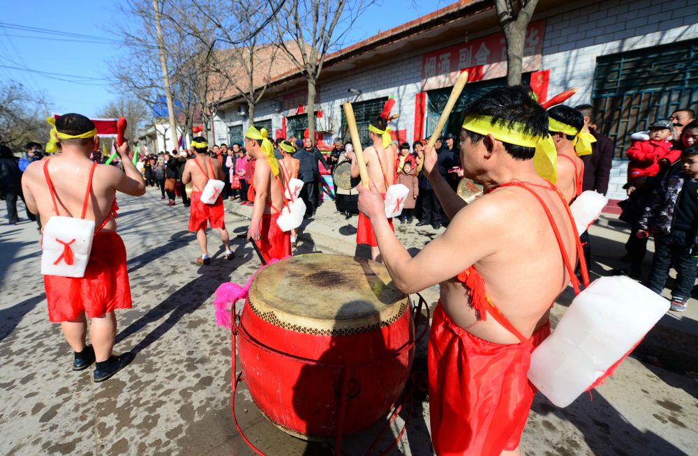 每年春節過(guò)后,山西省永濟市長(cháng)旺村的漢子們冒著(zhù)嚴寒袒胸裸背地表演背冰。他們在鑼鼓伴奏下列隊前行,模擬下河、破冰、匍匐前進(jìn)、刀槍不入等動(dòng)作,展現黃河兒女彪悍強壯的陽(yáng)剛之氣和“天不怕地不怕”的勇武精神。