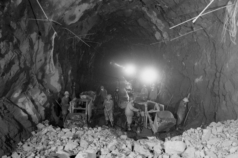 1982年,鐵道兵第八師指戰員在引灤入津工程隧道施工中人工裝運石渣。新華社發(fā)