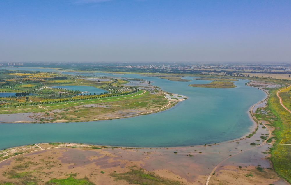 滹沱河生態(tài)修復工程石家莊藁城段廉州湖(2023年6月1日攝,無(wú)人機照片)。新華社記者 朱旭東 攝