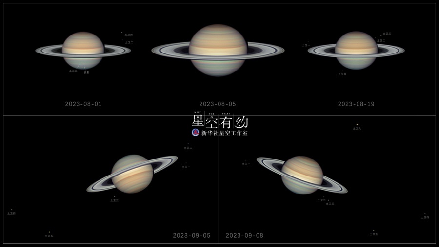 江蘇星空攝影愛(ài)好者陳蘇輝2023年8月和9月在江蘇南通拍攝到的土星特寫(xiě)(拼版照片)。(本人供圖)