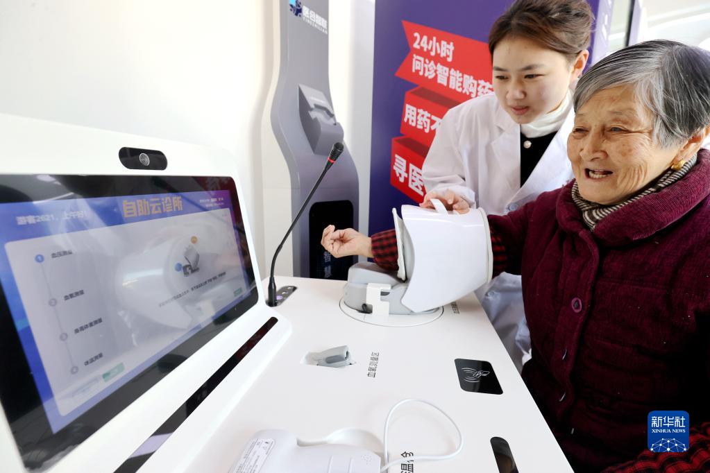 在浙江省湖州市德清縣阜溪街道興山未來(lái)社區居家養老服務(wù)中心,家庭醫生輔助社區老人進(jìn)行云問(wèn)診(2023年2月16日攝)。新華社發(fā)(謝尚國 攝)