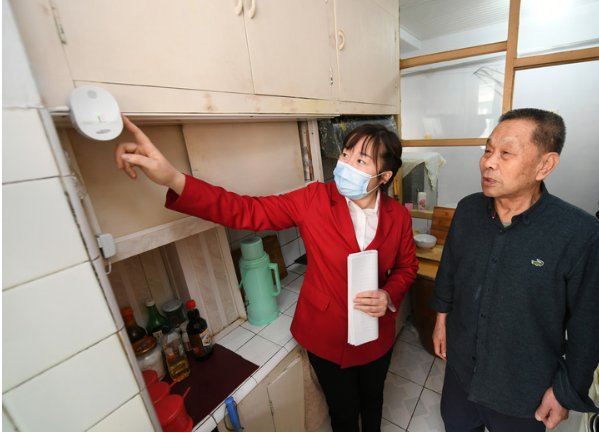 吉林省長(cháng)春市長(cháng)山花園社區黨委書(shū)記韓麗萍(左)到獨居老人家中檢查燃氣報警設備(資料照片)。新華社發(fā)
