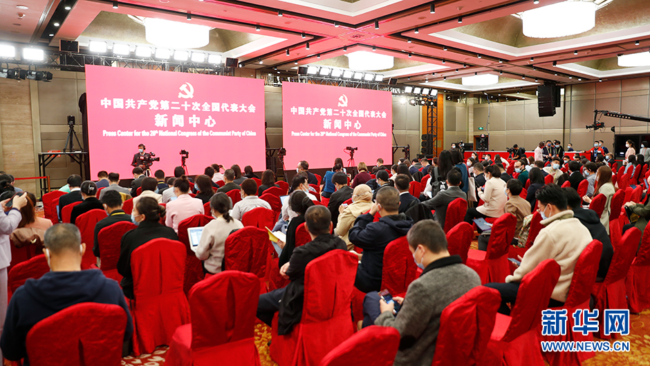 10月17日(星期一)15:00,二十大新聞中心將在梅地亞新聞中心二層新聞發(fā)布廳舉辦第二場(chǎng)記者招待會(huì )。圖為記者招待會(huì )前新世紀日航飯店三層世紀廳分會(huì )場(chǎng)。(新華網(wǎng) 陳杰 攝)