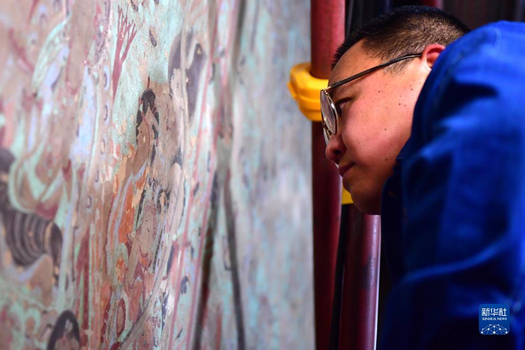 在莫高窟第231窟,敦煌研究院文物保護技術(shù)服務(wù)中心的壁畫(huà)修復工作者在修復出現病害的壁畫(huà)(2022年4月19日攝)。新華社記者 杜哲宇 攝