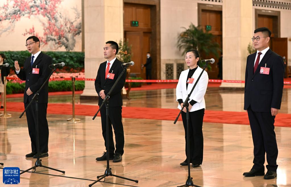 這是閉幕會(huì )后,楊新泉、劉秀祥、石玉蓮、安長(cháng)明代表(自左至右)接受采訪(fǎng)。