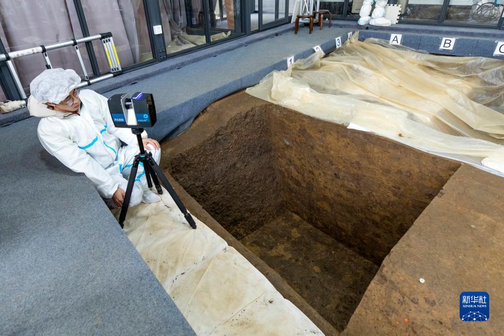 在三星堆遺址考古發(fā)掘現場(chǎng),考古人員用三維激光掃描儀掃描7號“祭祀坑”,并將利用掃描數據建立該“祭祀坑”的3D模型(2021年3月10日攝)。新華社記者 沈伯韓 攝