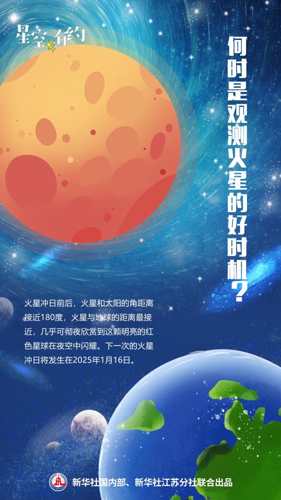 “火星沖日前后,火星和太陽(yáng)的角距離接近180度,火星與地球的距離最接近,幾乎可徹夜欣賞到這顆明亮的紅色星球在夜空中閃耀?!蓖蹩瞥f(shuō),下一次的火星沖日將發(fā)生在2025年1月16日。
