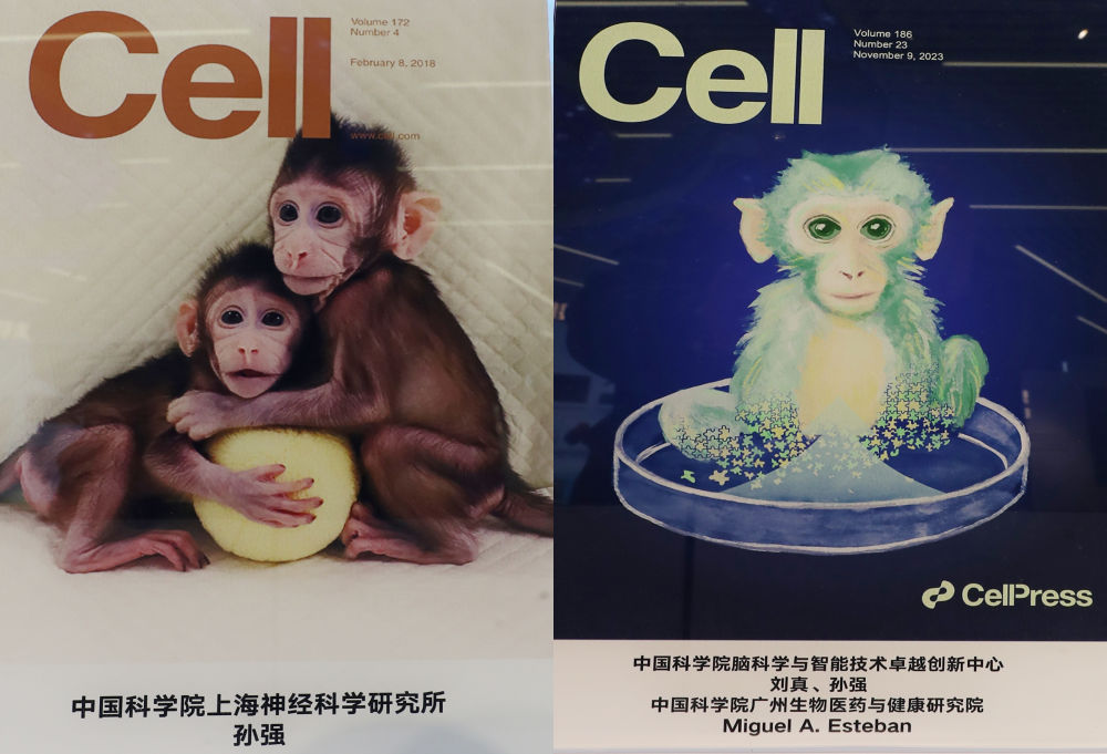 拼版照片是2023年11月29日在上??萍紕?chuàng )新成果展上拍攝的雜志封面,左為《細胞》封面的克隆猴“中中”和“華華”,右為《細胞》封面的一只來(lái)自中國的“嵌合猴”。新華社記者 方喆 攝