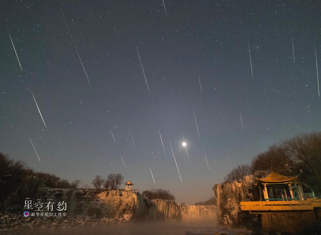 黑龍江星空攝影愛(ài)好者王寶勛2022年12月14日在黑龍江牡丹江鏡泊湖景區拍攝的雙子座流星雨(多張疊加)。(本人供圖)