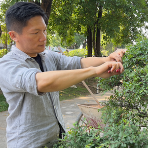 陳岱明在修剪園中植物。新華社記者 付敏 攝