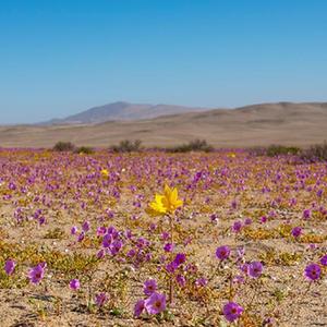 在冬季降水量較多的年份,開(kāi)春之后,阿塔卡馬沙漠最南部靠近海岸的地方會(huì )有很多沙漠植物發(fā)芽、開(kāi)花。由于今年6月至8月阿塔卡馬沙漠南緣經(jīng)歷了幾場(chǎng)降水,春季到來(lái)時(shí),這里便綻放出大片的花毯?!伴_(kāi)花的沙漠”這一現象作為智利北部春季偶有出現的美景,吸引了各地的旅游者,也為當地科學(xué)家研究耐旱植物特性、利用基因技術(shù)發(fā)展耐旱作物提供了“天然實(shí)驗室”。