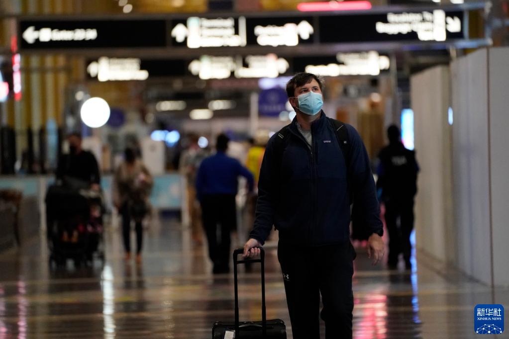11月8日,在美國弗吉尼亞州阿靈頓的里根國家機場(chǎng),旅客戴著(zhù)口罩走在航站樓里。