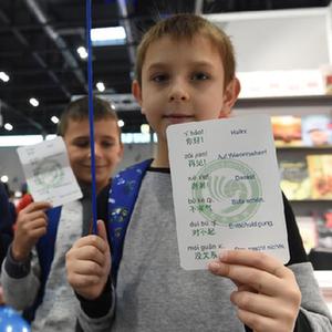 11月11日,孩子們在奧地利維也納書(shū)展的維也納大學(xué)孔子學(xué)院展臺前展示學(xué)習漢語(yǔ)小卡片。