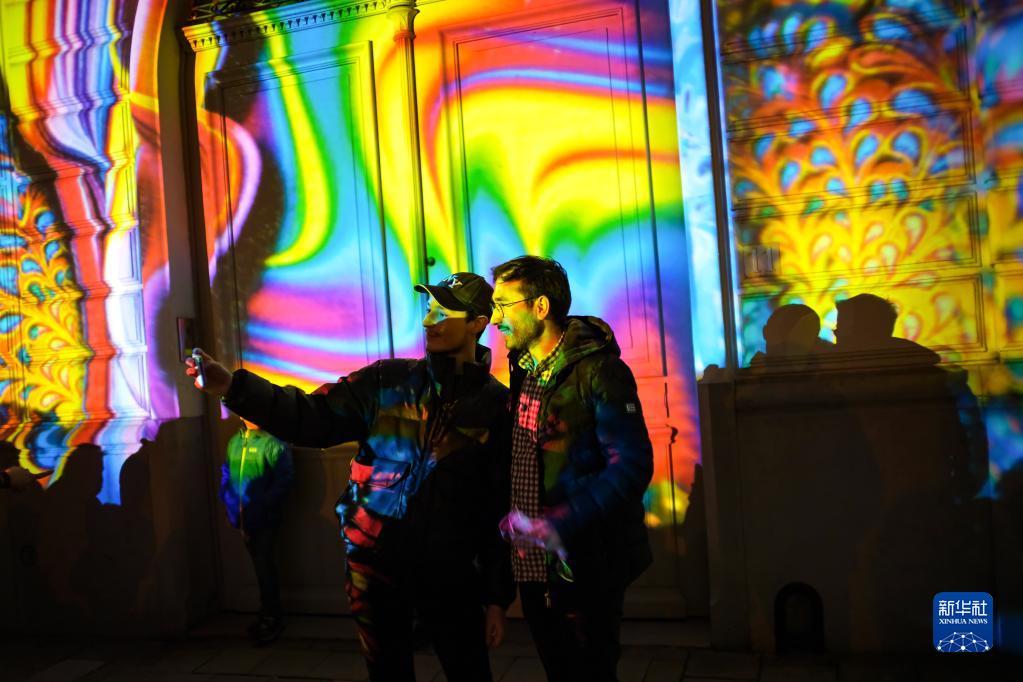 11月11日,人們在比利時(shí)根特燈光節上游覽時(shí)自拍合影。
