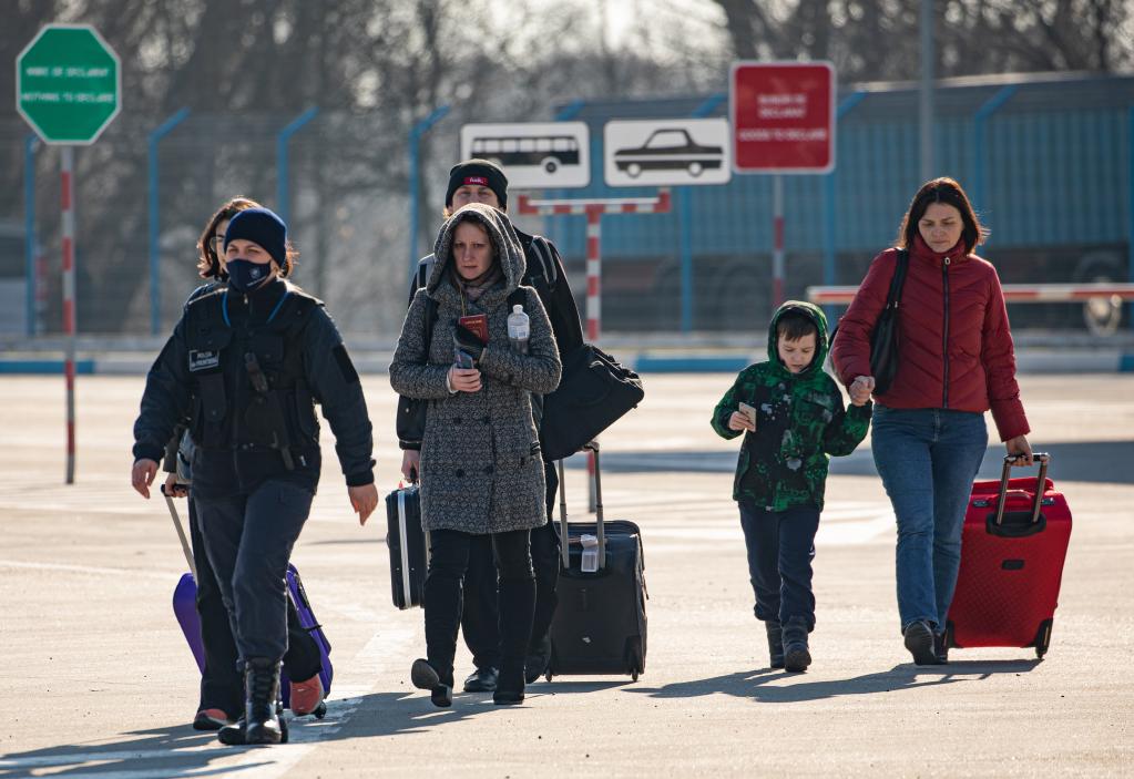 2月25日,一些烏克蘭民眾抵達摩爾多瓦邊境的帕蘭卡檢查站。新華社/衛星社