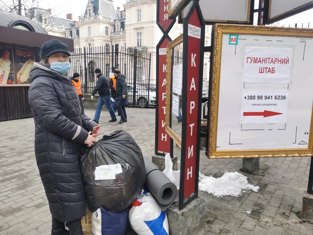 3月1日,一名女子在烏克蘭利沃夫的一處物資發(fā)放點(diǎn)領(lǐng)取生活用品。新華社記者陳文仙攝