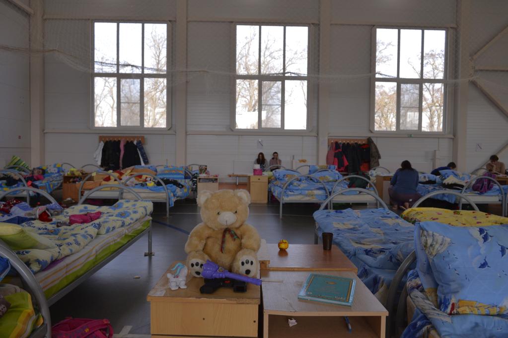 2月22日,在俄羅斯羅斯托夫州,玩具熊被擺放在一處為烏克蘭東部難民設置的臨時(shí)安置點(diǎn)內。新華社發(fā)(安德烈攝)