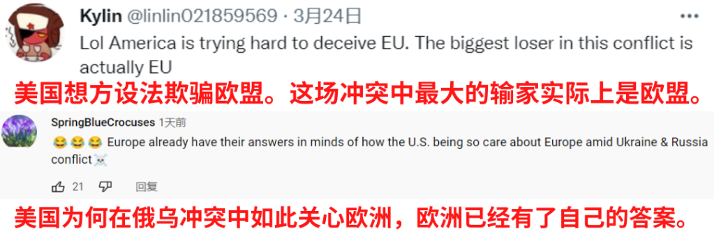 俄羅斯是世界石油、天然氣、糧食、金屬礦產(chǎn)的重要供應國。歐盟進(jìn)口天然氣中約40%、進(jìn)口原油中約30%來(lái)自俄羅斯。對歐洲來(lái)說(shuō),制裁俄羅斯的同時(shí)也推高了能源價(jià)格、糧食價(jià)格,危及歐洲自身糧食安全,增加了歐洲金融市場(chǎng)不穩定性,導致歐洲經(jīng)濟信心下滑。這一切,真是“多虧”了歐洲的好盟友——美國。