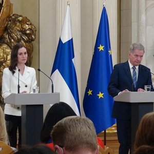 5月15日,在芬蘭赫爾辛基,芬蘭總統尼尼斯托(右)和總理馬林參加聯(lián)合記者會(huì )。新華社記者陳靜攝