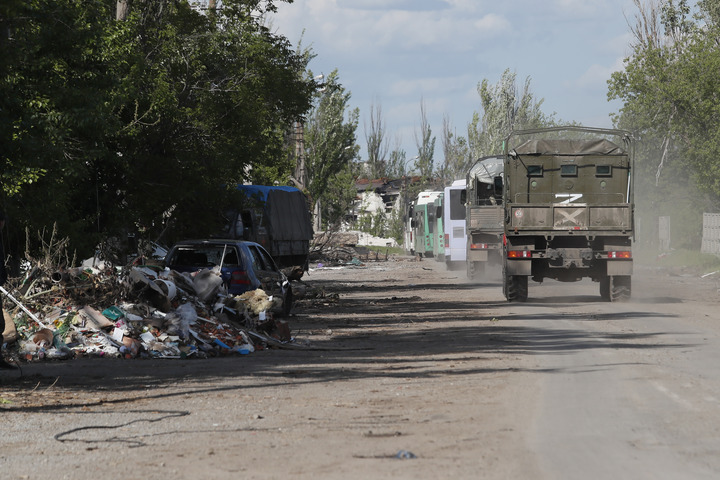 5月20日,載著(zhù)烏克蘭武裝人員的巴士駛離馬里烏波爾。(新華社發(fā),維克托攝)