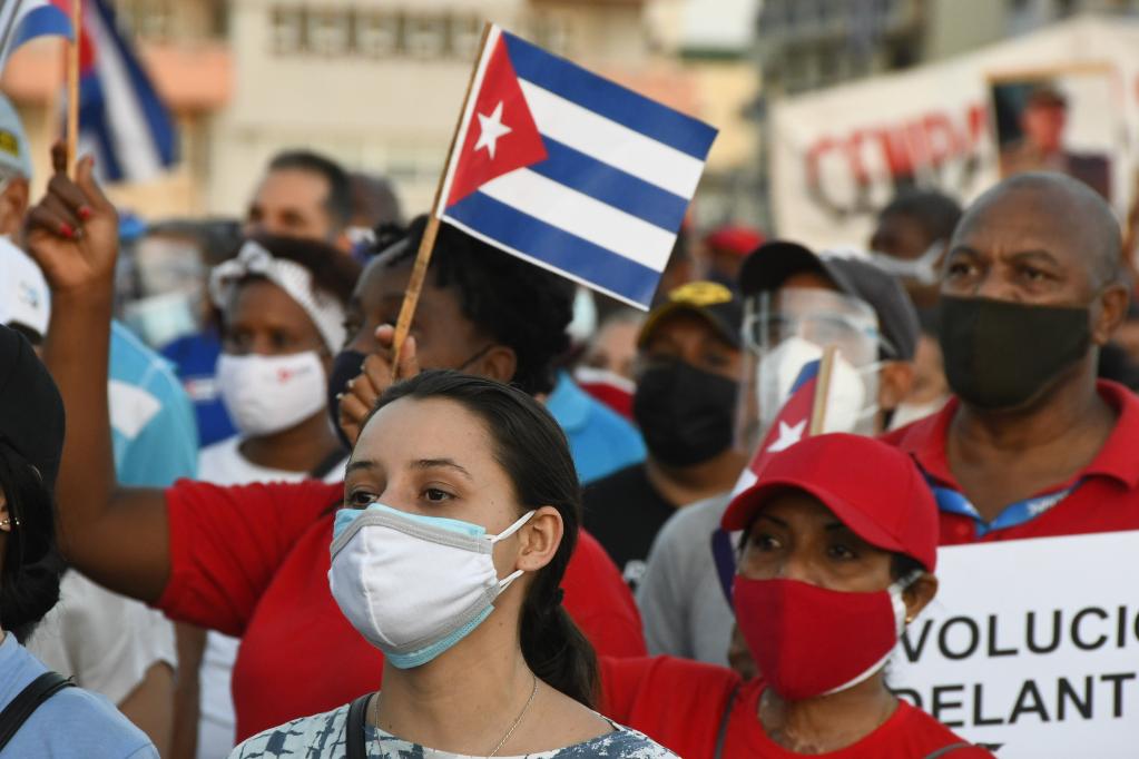 2021年7月17日,約10萬(wàn)民眾在古巴首都哈瓦那參加愛(ài)國集會(huì ),抗議美國對古巴長(cháng)期封鎖、反對美國政府資助反古勢力煽動(dòng)騷亂。新華社發(fā)(華金·埃爾南德斯攝)