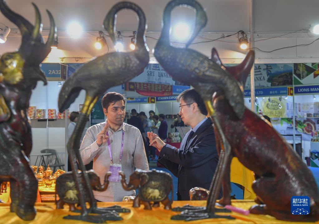 2019年4月18日,在福建泉州石獅市舉行的第五屆中國(泉州)海上絲綢之路國際品牌博覽會(huì )上,印度客商(左)向顧客推銷(xiāo)印度工藝品。 新華社記者 宋為偉 攝