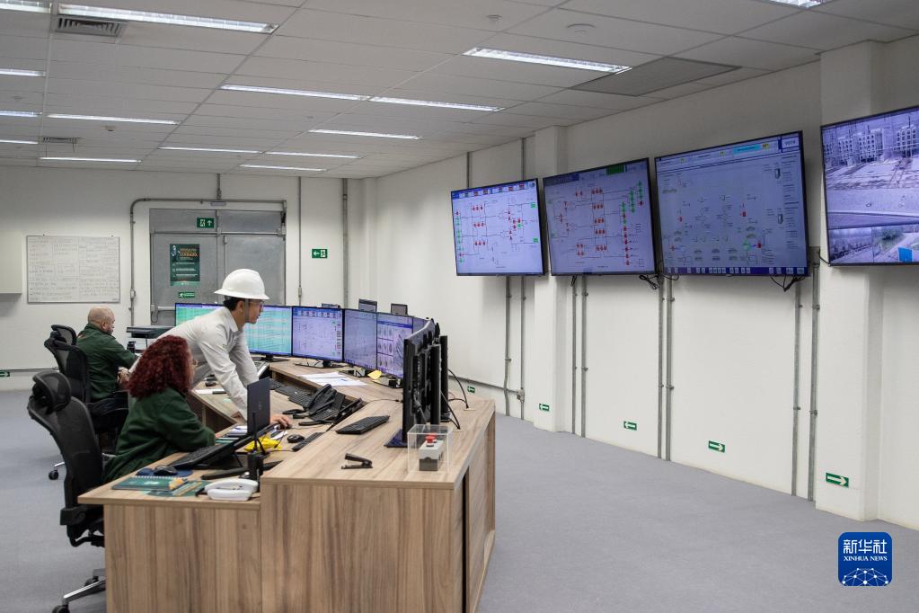9月30日,在巴西里約熱內盧美麗山特高壓輸電二期項目里約換流站,國網(wǎng)巴控公司換流站運維主管許鴻飛(淺色工裝者)和巴方人員在控制室工作。新華社記者 王天聰 攝
