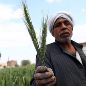 3月14日,農民在埃及蓋勒尤卜省的農田中展示麥穗。新華社發(fā)(艾哈邁德·戈馬攝)