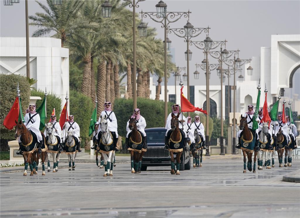 習近平在穆罕默德王儲陪同下檢閱王宮儀仗隊。沙特王宮衛隊以傳統執劍禮儀向習近平表示最隆重歡迎。