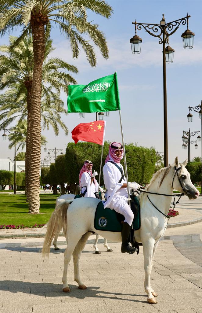 當地時(shí)間12時(shí)20分許,在沙特王宮摩托車(chē)隊和馬隊護衛下,習近平乘車(chē)抵達王宮辦公廳廣場(chǎng)。